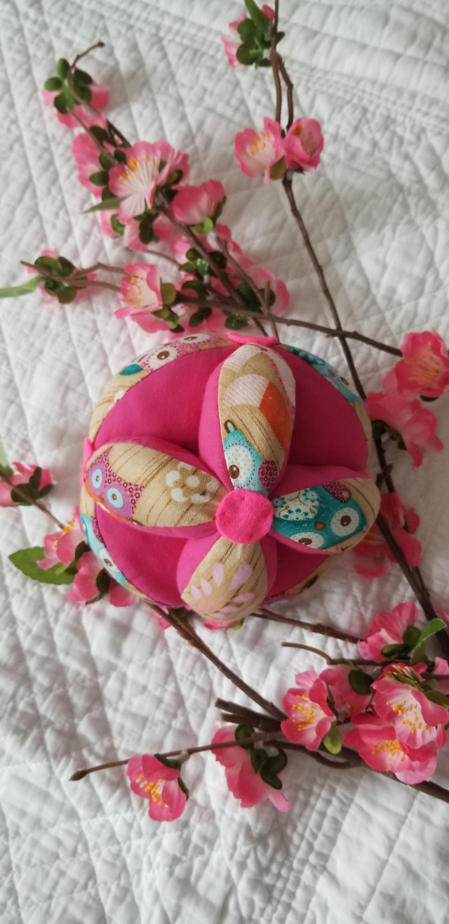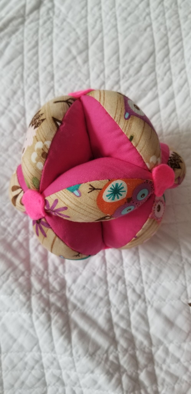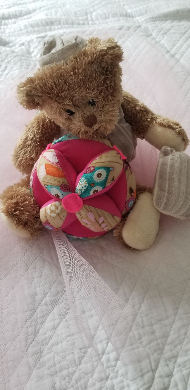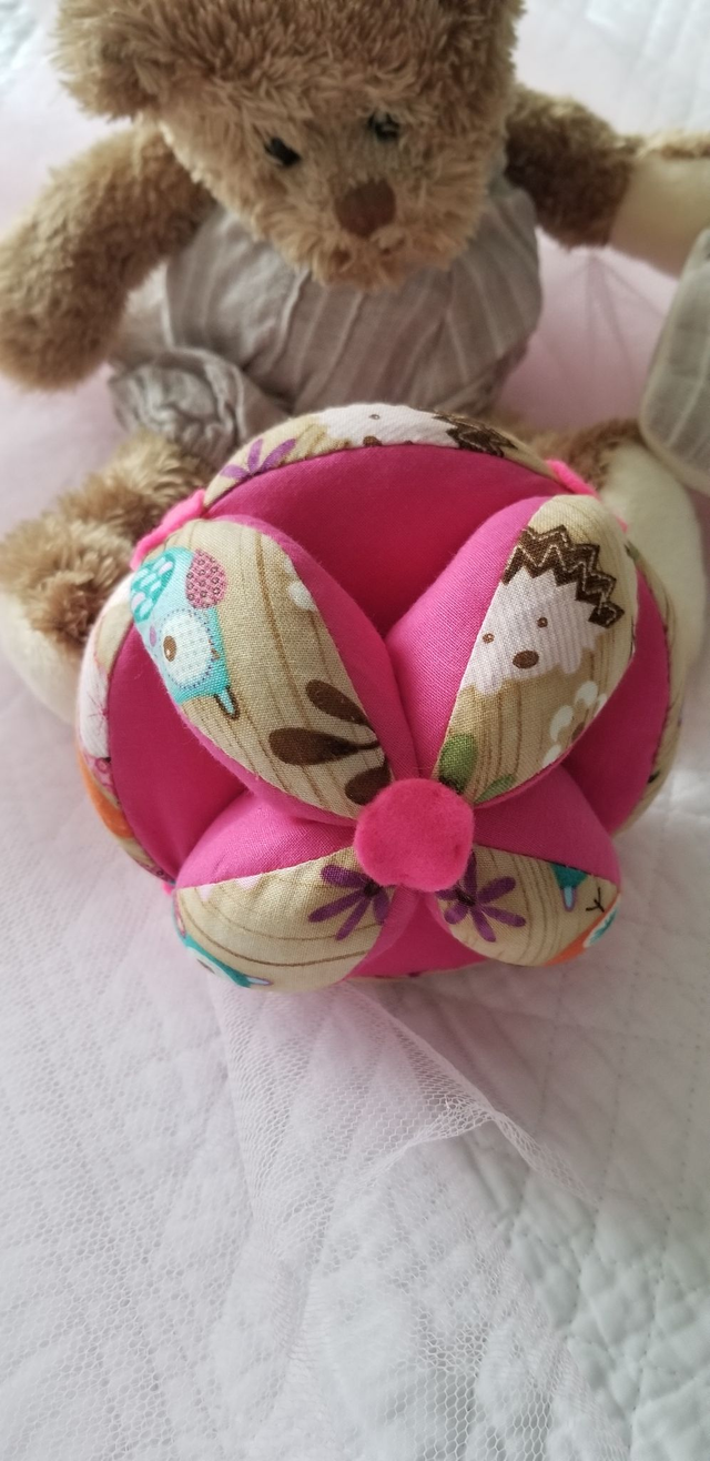 Votre enfant peut la passer de main à main, la faire rouler et aller la chercher. Elle incite votre enfant à se déplacer en utilisant sa motricité globale. C' est une pièce unique, confectionnée entièrement à la main.