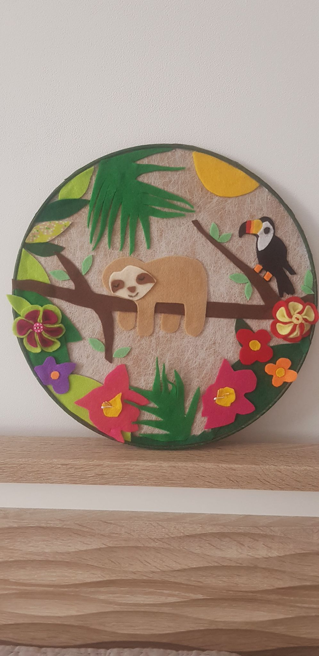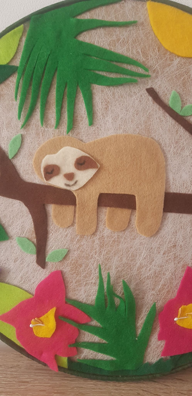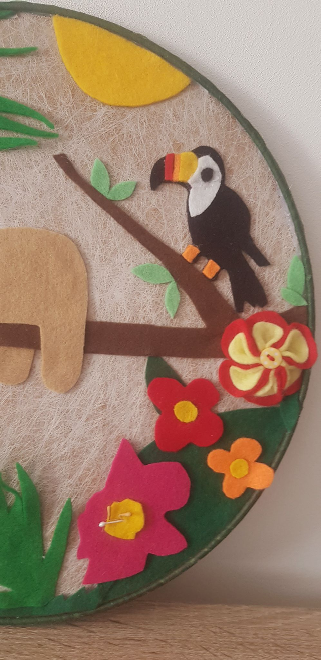 Cette décoration murale "Le Paresseux" est une décoration ludique, elle permet à l'enfant de découvrir l'environnement où l'animal vit, dans la forêt tropicale. Elle est agréable à regarder avec ses couleurs et ses textures en relief. Vous pouvez l'accrocher sur un mur ou la poser sur une commode.