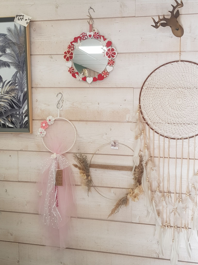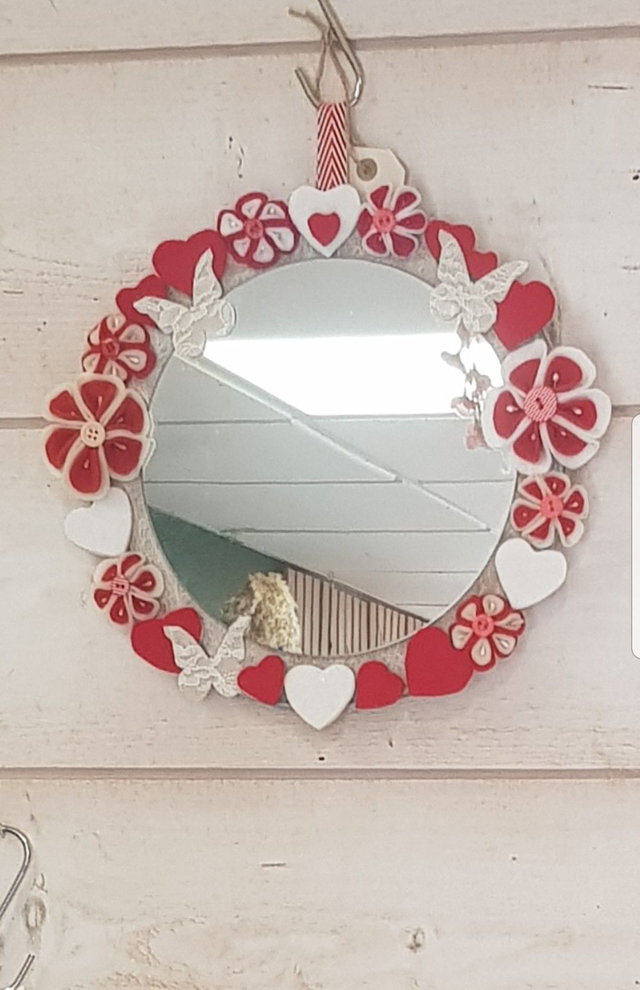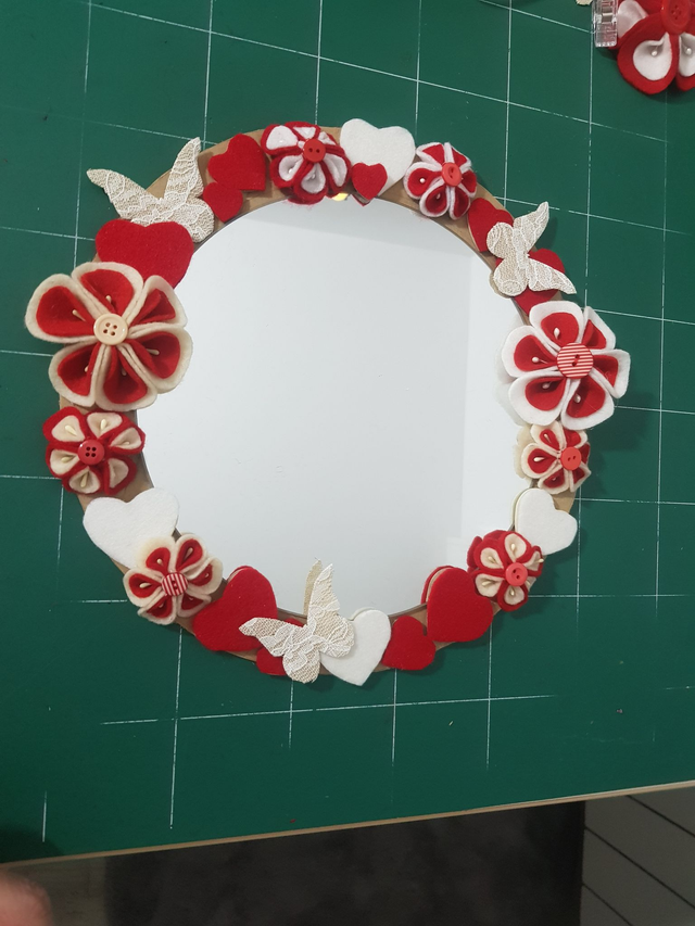 Ce miroir est original, en relief, décoré avec de la feutrine, les fleurs sont entièrement cousues à la main, beaucoup de détails sur ce joli miroir.